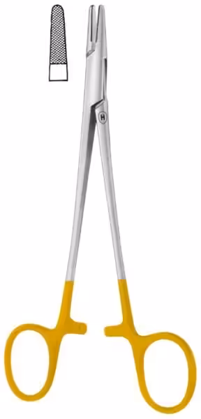 Hegar-Baumgartner model iğne tutucu. 140mm, sert metal insert. Paslanmaz çelik. Dental sütür prosedürleri için.